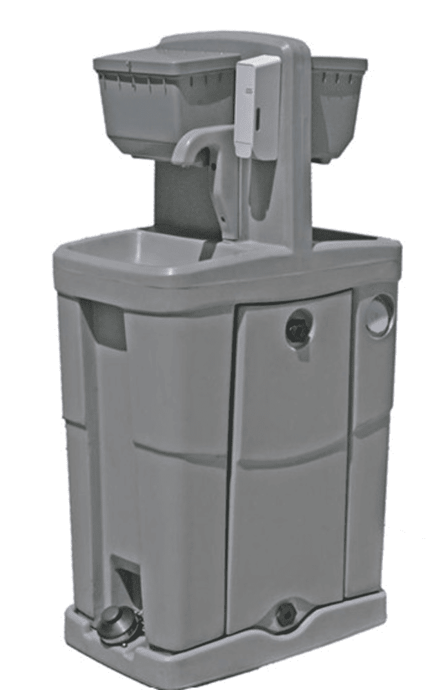 Estos se pueden instalar en cualquier lugar, con su propio tanque de agua limpia y tanque para recolectar el agua residual, accionado con bomba de pie. Los cuales se limpian con tanques y bombas de vacío. Incluyen despachador de jabón y toallas interdobladas para secado de manos. Su base esta acondicionada con ruedas para su fácil transportación.